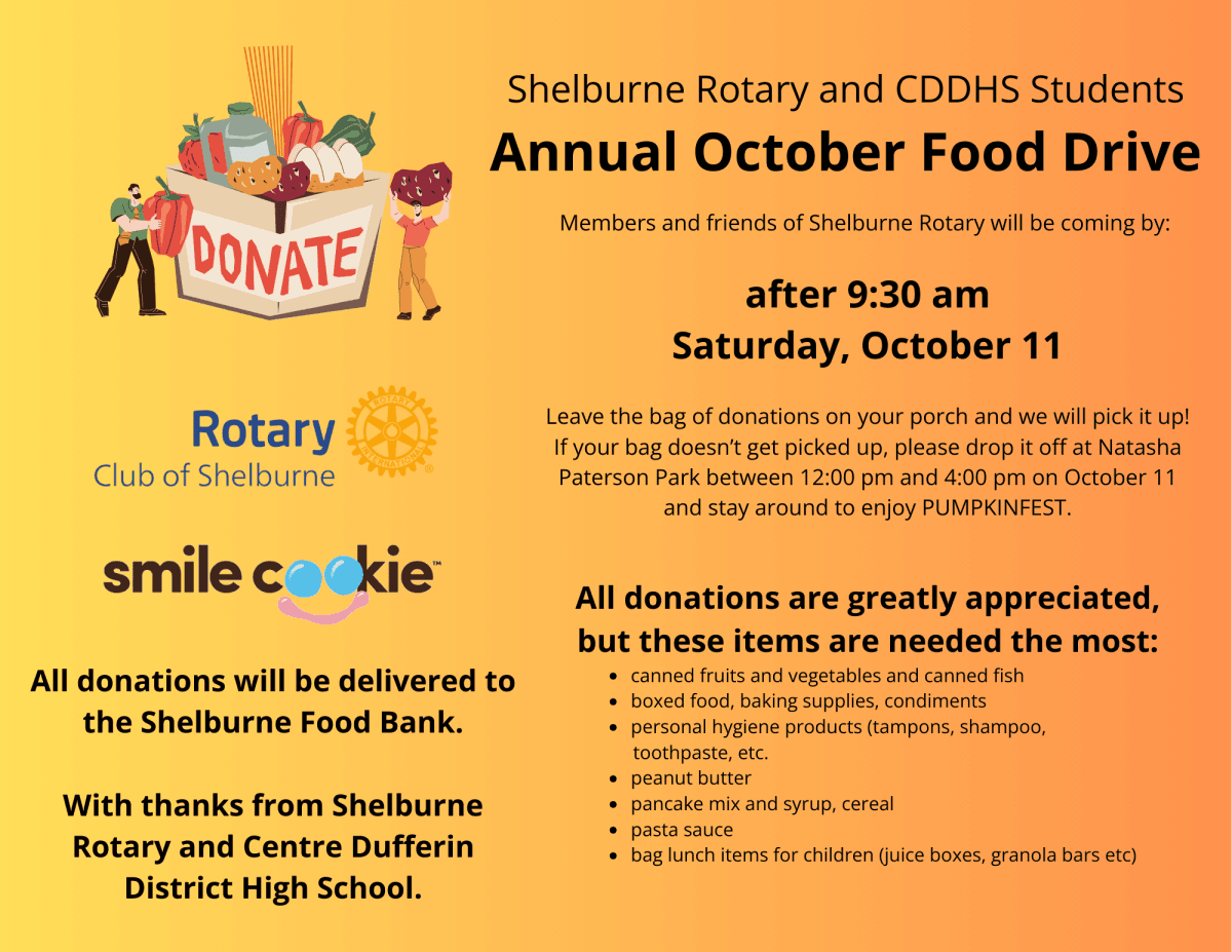 This Thanksgiving Weekend (Saturday, October 11) members and friends of the Shelburne Rotary Club will once again be collecting food donations for the Shelburne Food Bank.