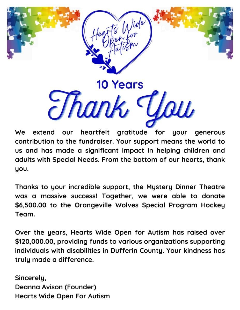 Shelburne Rotary is proud to again support Hearts Wide Open for Autism. This year’s funds are being donated to the Orangeville Wolves Special Program hockey team. The team is made up of people with intellectual disabilities ranging in age from 6 to 60. This organization provides the opportunity for those with Special Abilities to be included where they otherwise wouldn’t be.