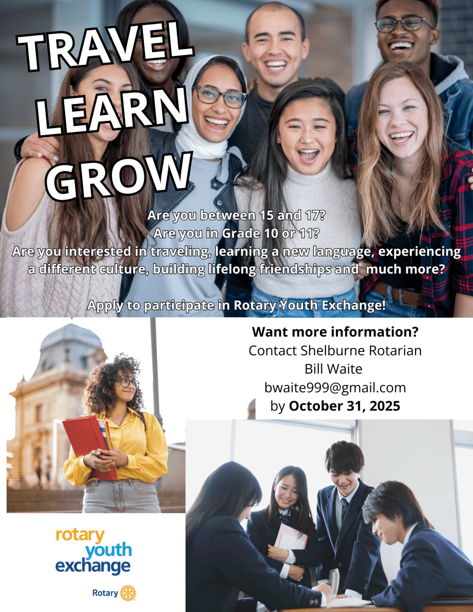 If you are interested in taking part, please contact Shelburne Rotary Youth Exchange Officer Bill Waite at bwaite999@gmail.com by October 31, 2025.